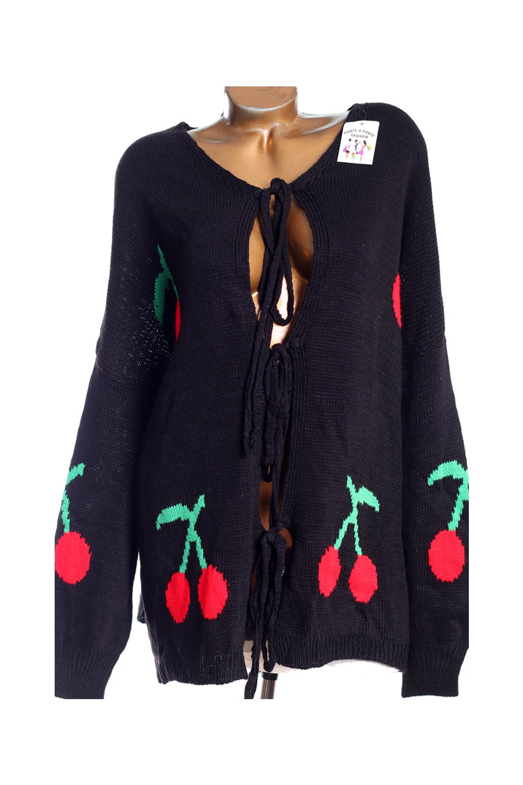 Dámský elastický, černý svetr s motivem třesní / XXXXL+ (56/58) / ANGLIE 28/30