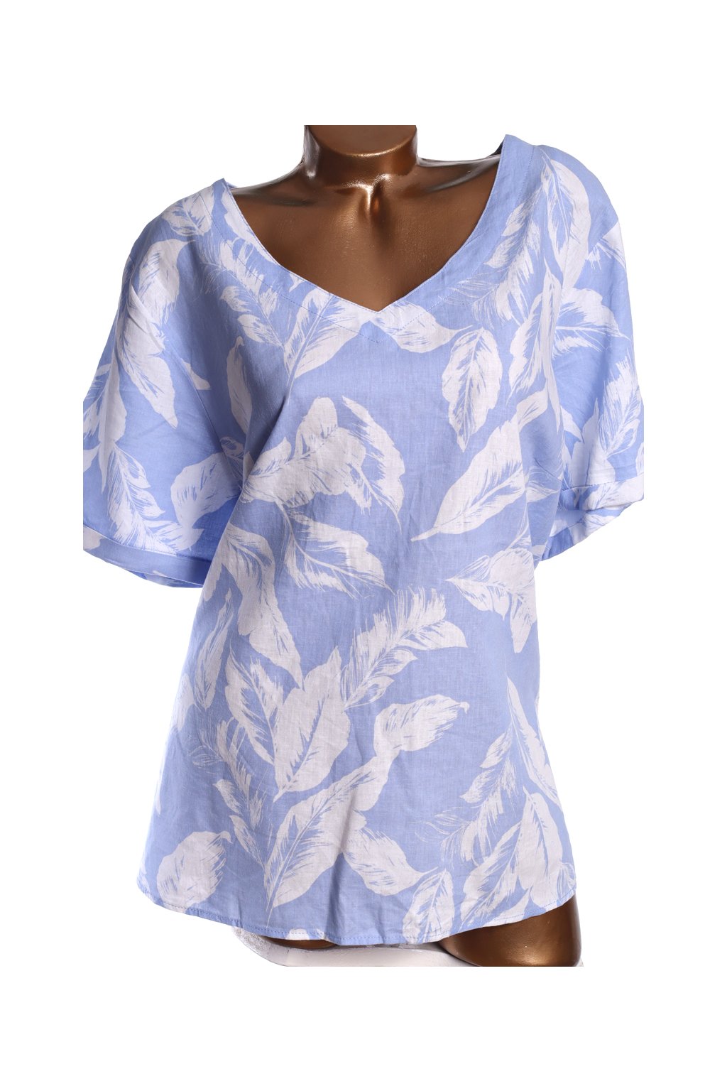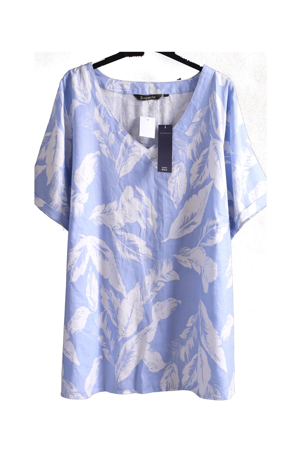 Dámská modro-bílá květovaná lněná halenka / BONMARCHÉ /XXXXL (52) / UK 24 / ANGLIE