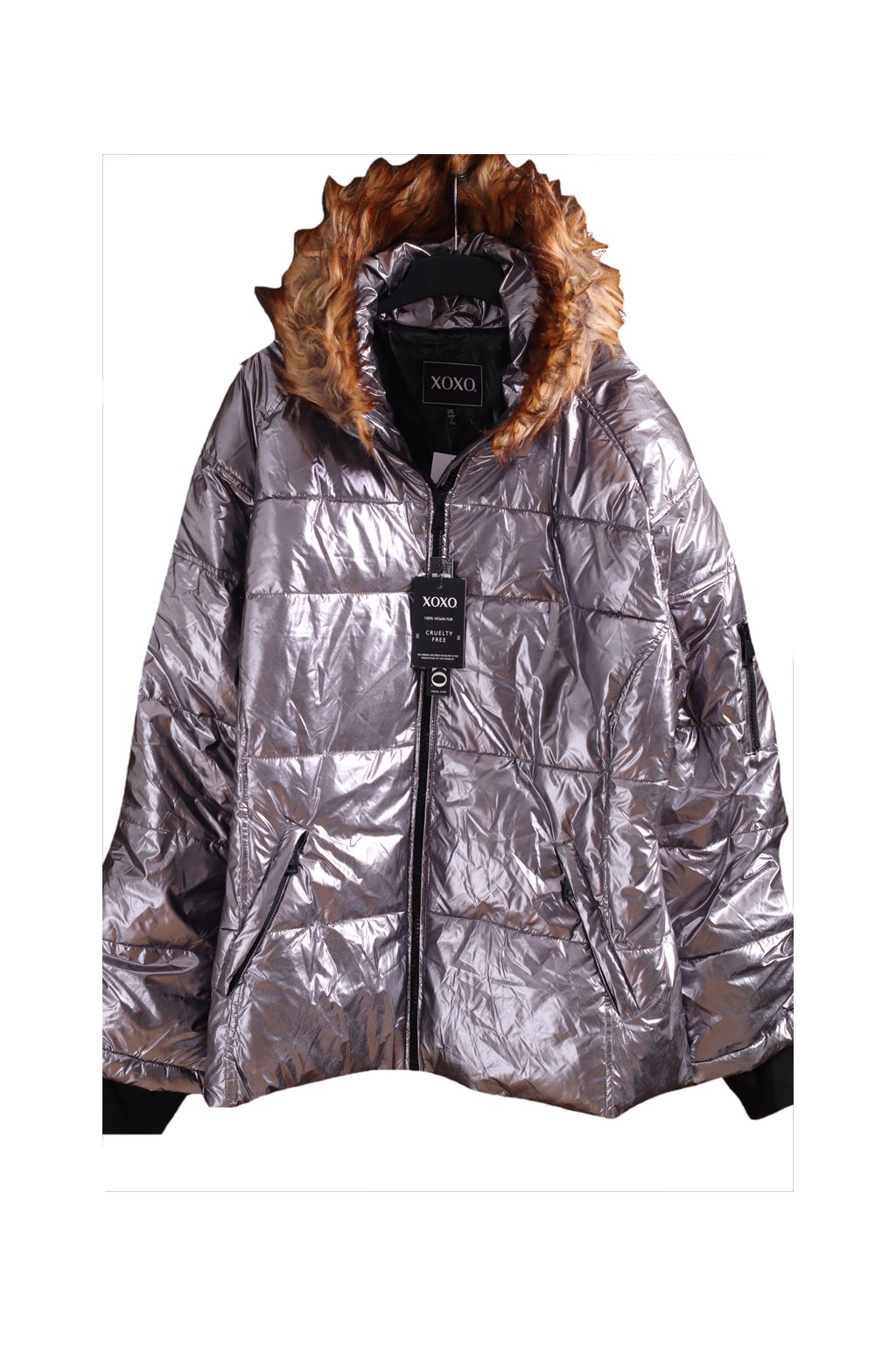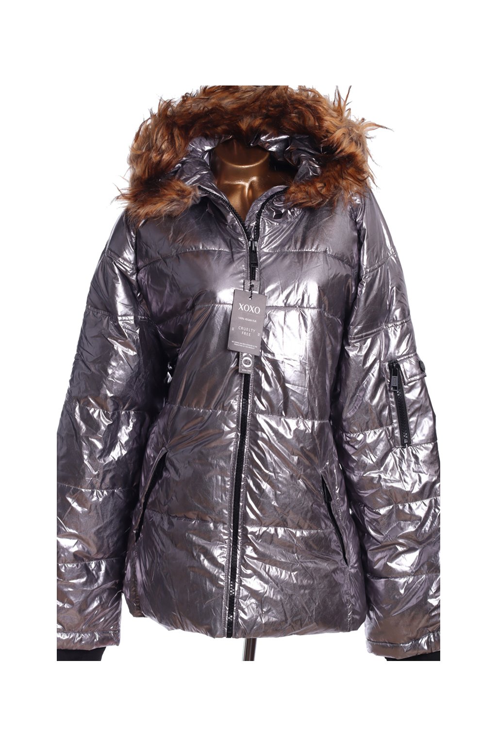 Dámská zimní stříbrná lesklá bunda s kožíškem na kapuci / XOXO / XXXXL (48/50) / UK 20/22 ANGLIE