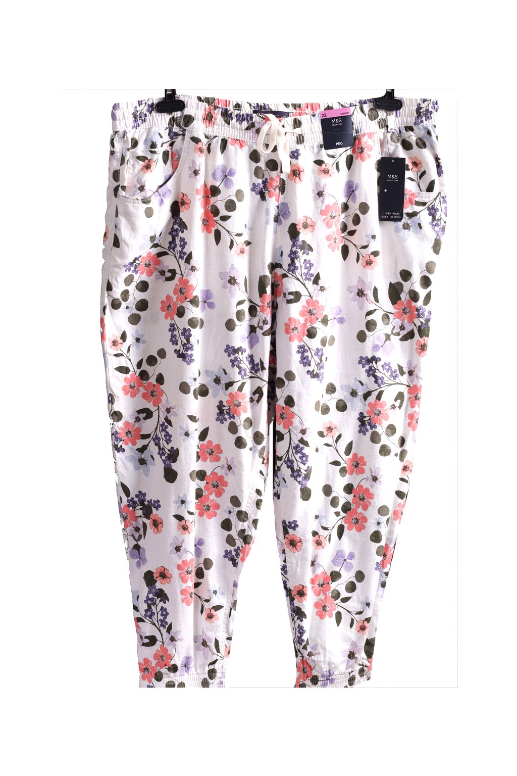 Dámské bílé lněné kalhoty s květy / Marks&Spencer / XXXL (50) / UK 22 / ANGLIE