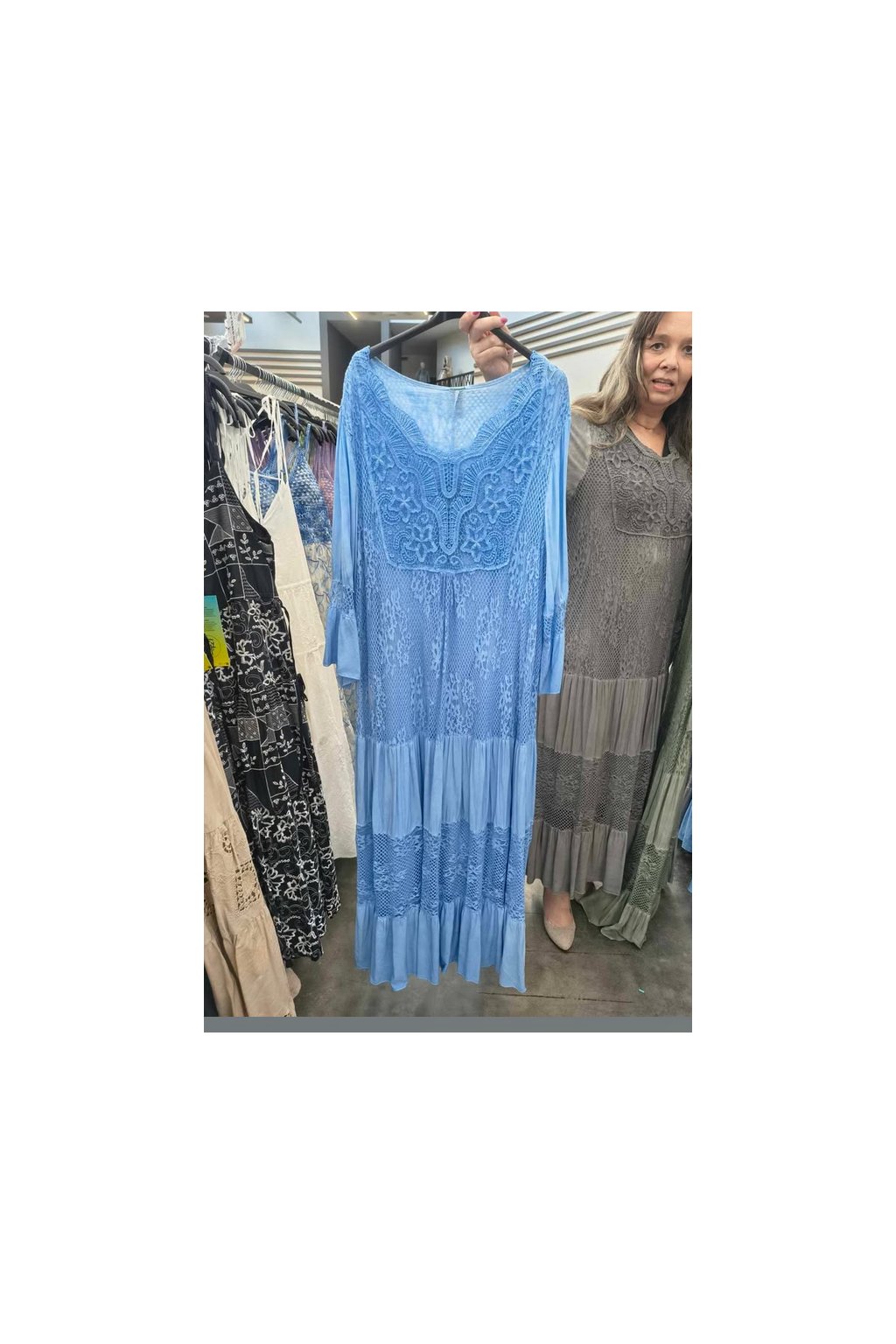 Dámské elastické modré krajkové šaty / MODA iTALA / XXXL (40/42/44/46/48/50) / - prsa v klidu 120 cm, po natažení 130 cm, pokud Vám nevadí volnější může být klidně od velikosti 40+, ůostava je vysoká 182 cm
