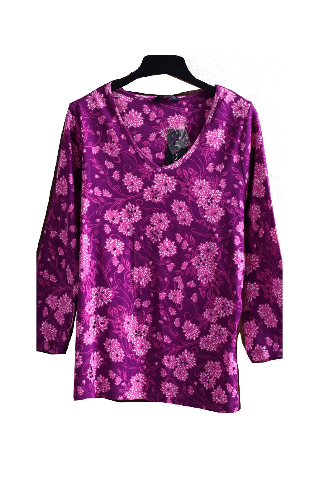 Dámské fialové triko s dlouhým rukávem s růžovými květy a kamínky / CLASSICS / XXXL (44) / UK 16 / ANGLIE