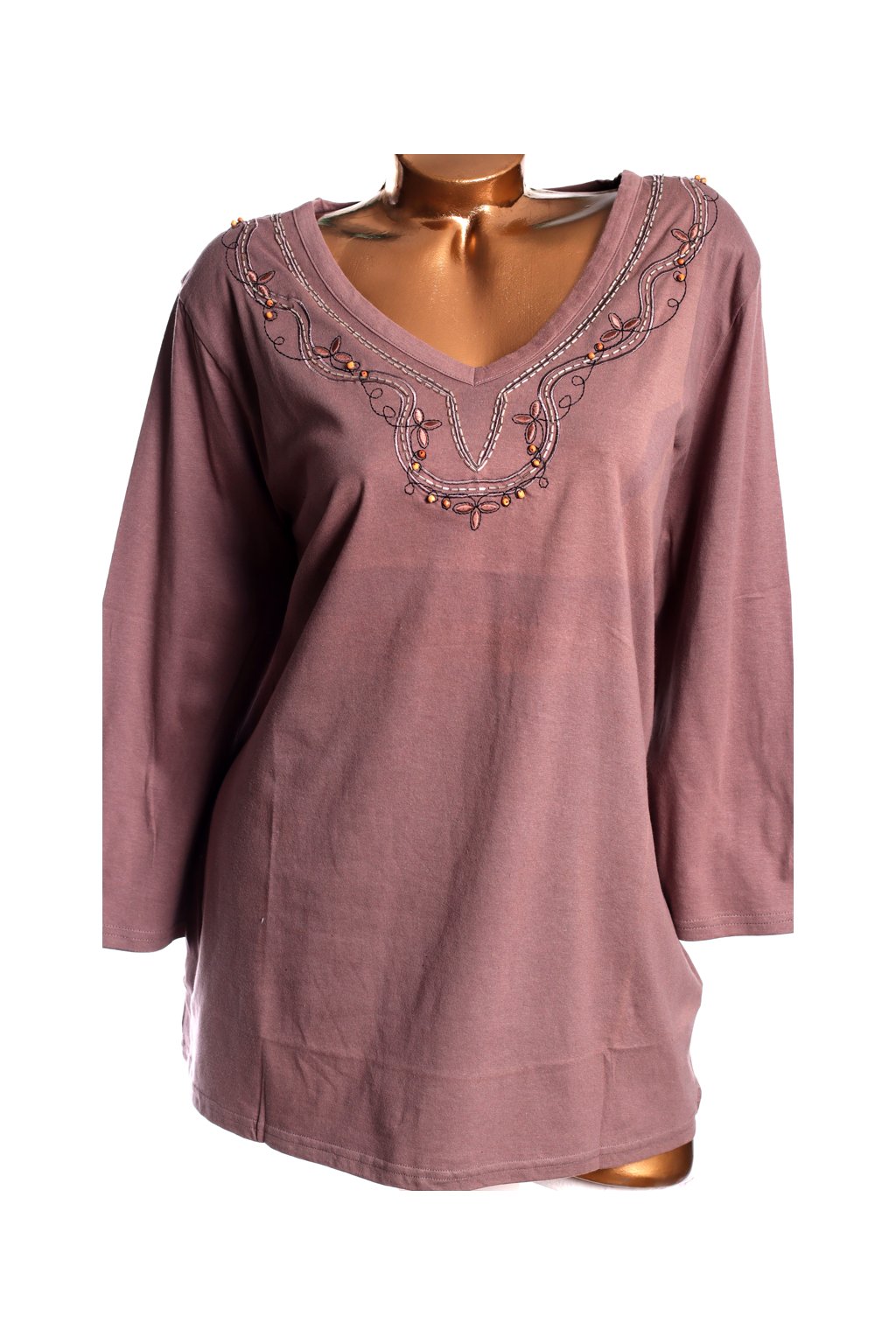 Dámské hnědé triko s kamínkovými a výšivkovými vzory u dekoltu / TOMMY KATE / XXXL (50) / UK 22 / ANGLIE