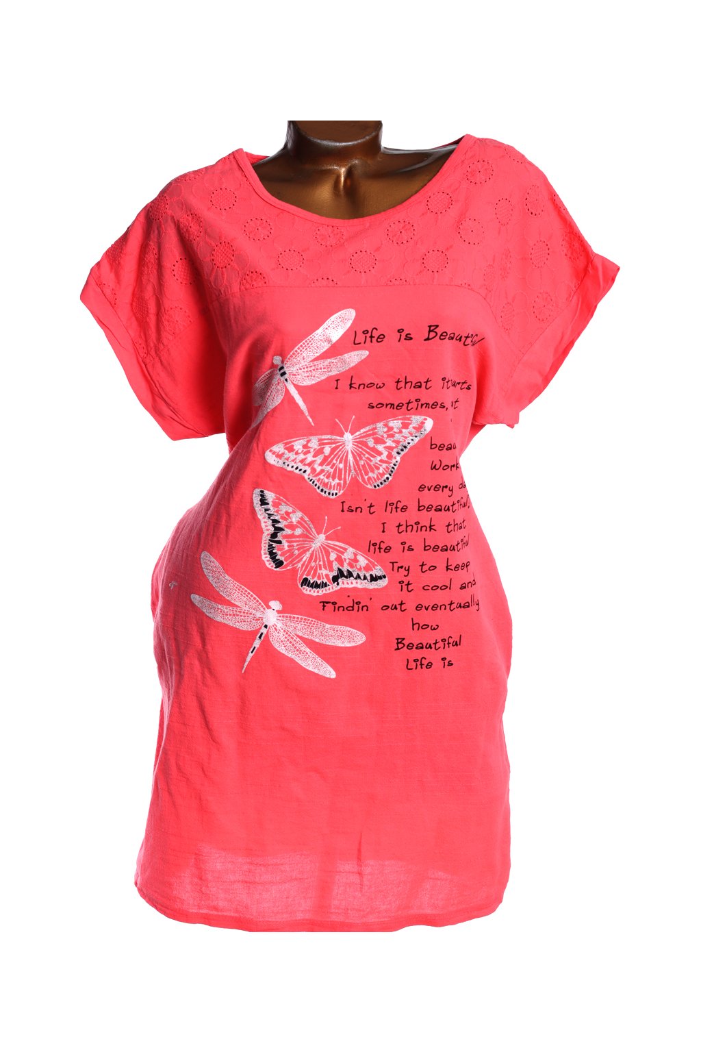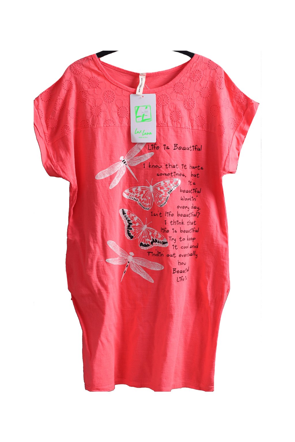 Dámské korálové šaty s černým nápisem a vážkami / New collection / (44/46)/ uK 16/18 ANGLIE