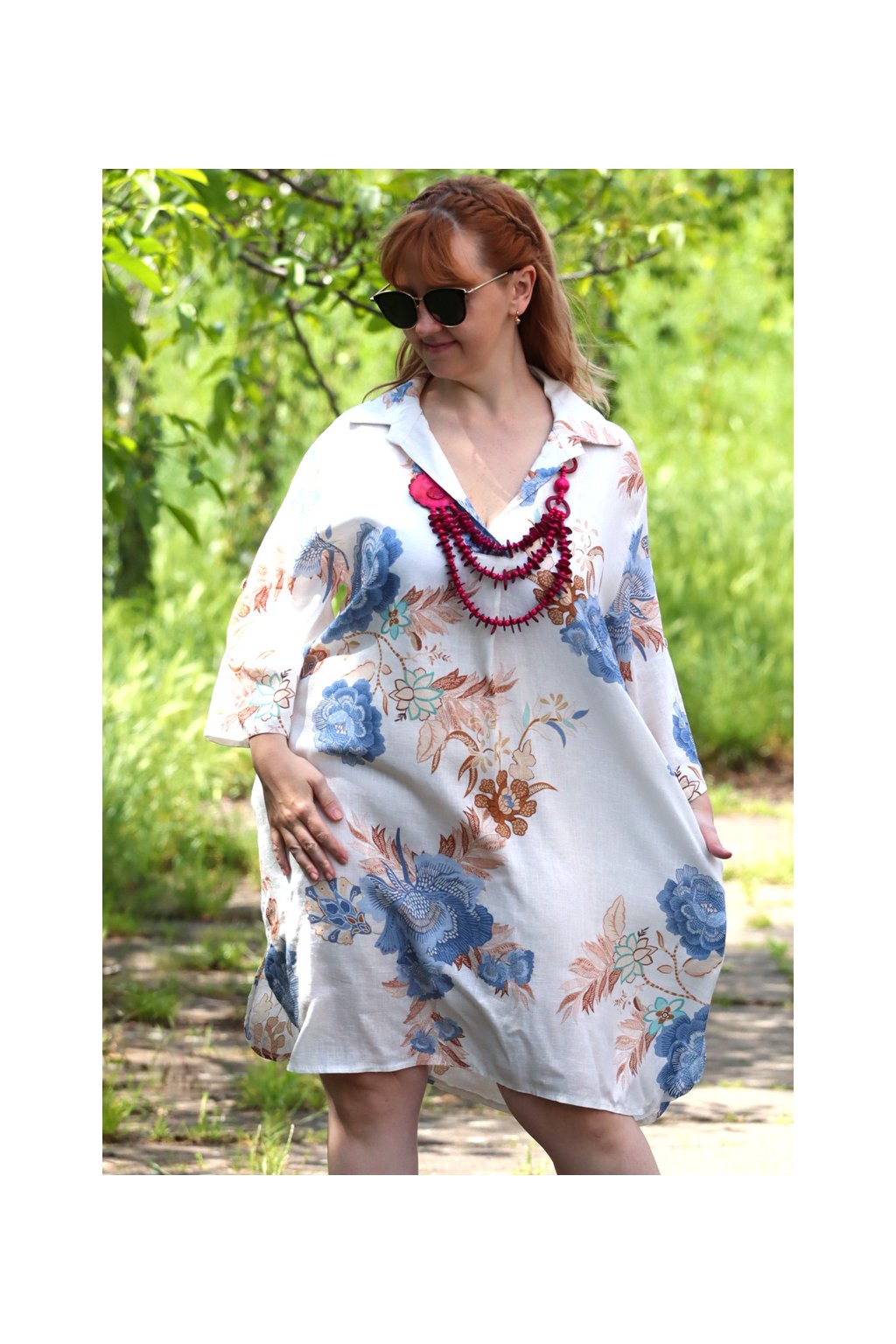 Dámské lněné béžové šaty s květinami / BONNY / /XL-XXL (42/44/46/48) / prsa do max. 125 cm/ MODA ITALY