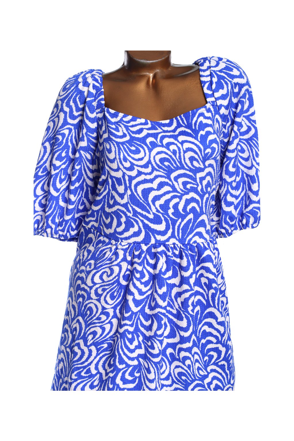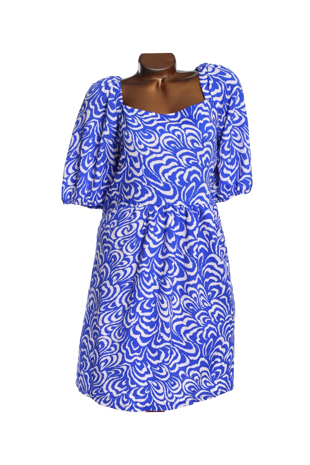 Dámské modré elastické šaty s balónovými rukávy a bílým vzorem / XXXL (50) / ANGLIE 22