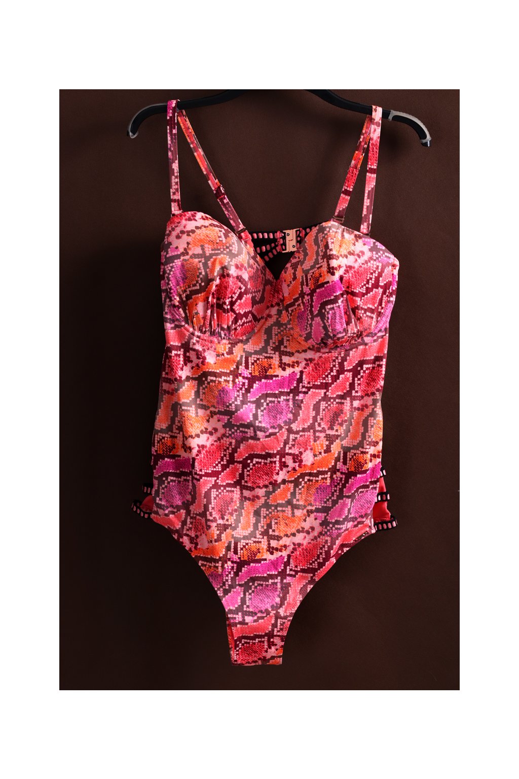 Dámské růžovo-černé jednodílné plavky s motivem hadí kůže (košíček 95G / UK 42E) /