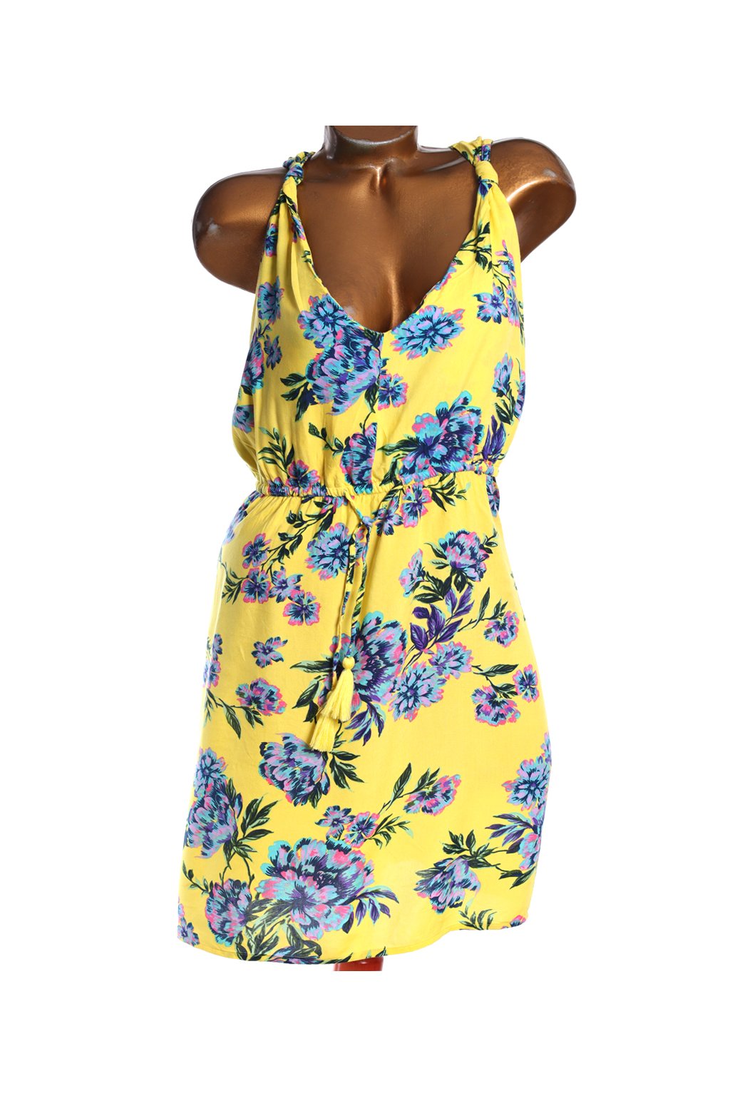 Dámské žluté šaty s modro-fialovo-růžovými květy / MS / XXXXL (52) / ZK 24 ANGLIE