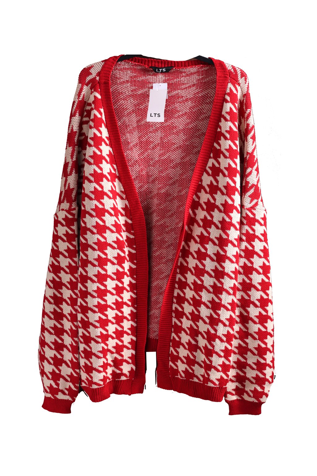 Dámský červeno-šedý vzorovaný svetrový kabát / LTS / XXXXL+ (54-56) / UK 26-28 / ANGLIE