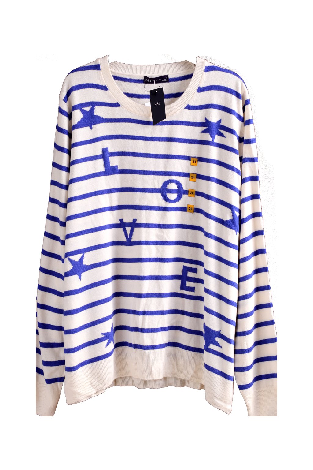 Dámský krémovo-modrý pruhovaný svetr s nápisem a hvězdami / Marks & Spencer / XXXXL (52) / UK 24 / ANGLIE