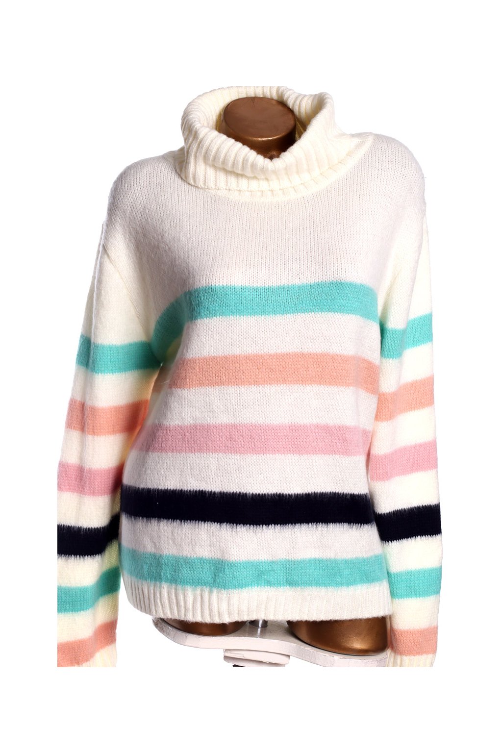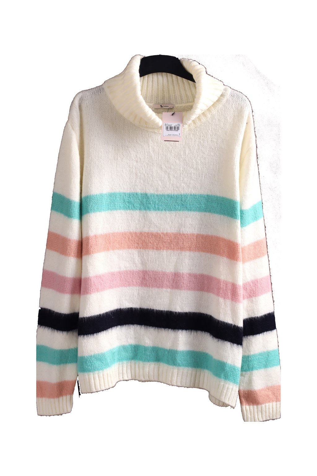 Dámský krémový rolákový svetr se zeleno-růžovo-černými pruhy / TU / XXXXL (52) / UK 24 / ANGLIE