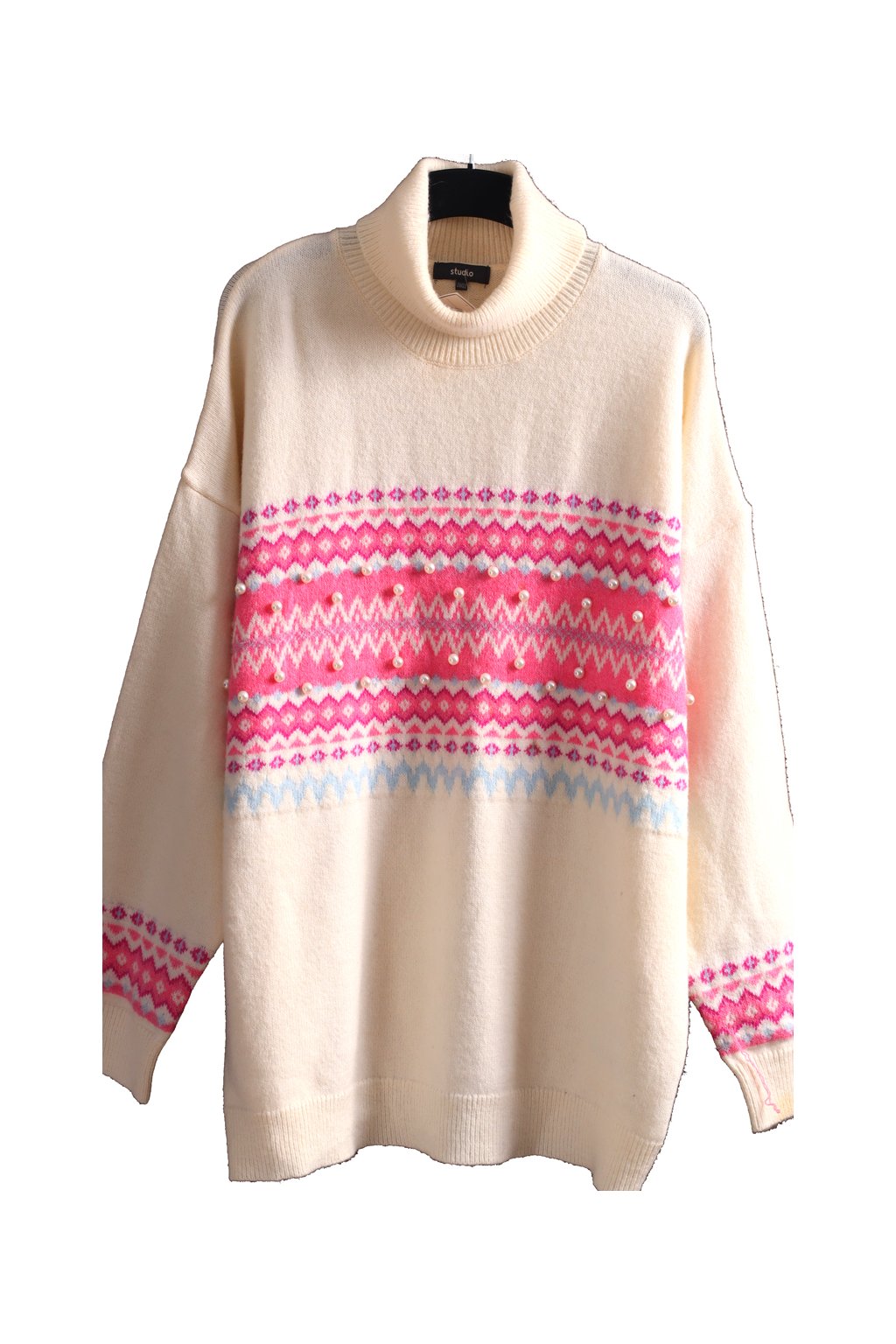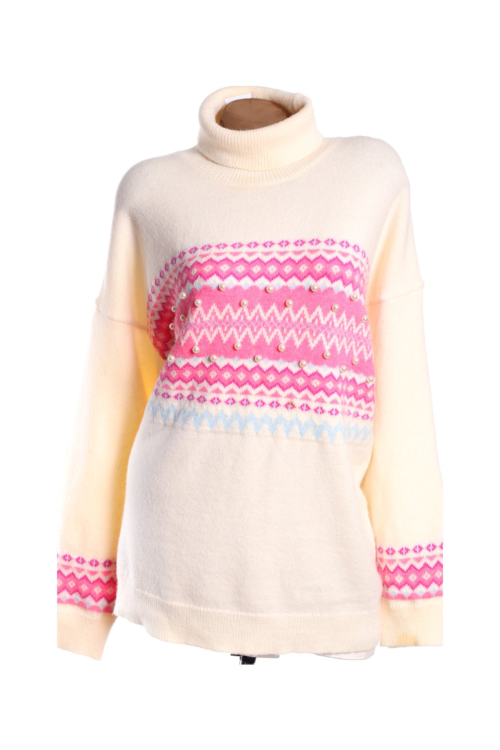 Dámský krémový svetr s růžovými vzory a perličkami / STUDIO / XXXL (48-50/52++) / UK 20/22 / ANGLIE