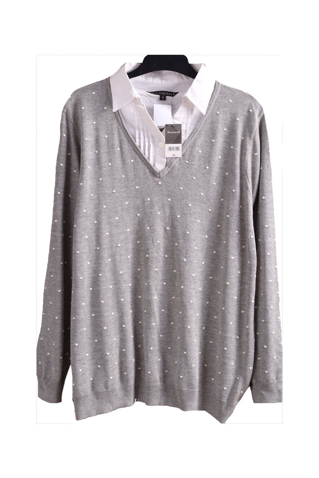 Dámský šedý svetr s bílými puntíky 2v1 s košilí / BONMARCHÉ / XXXL (48/50++) / UK 20 / ANGLIE