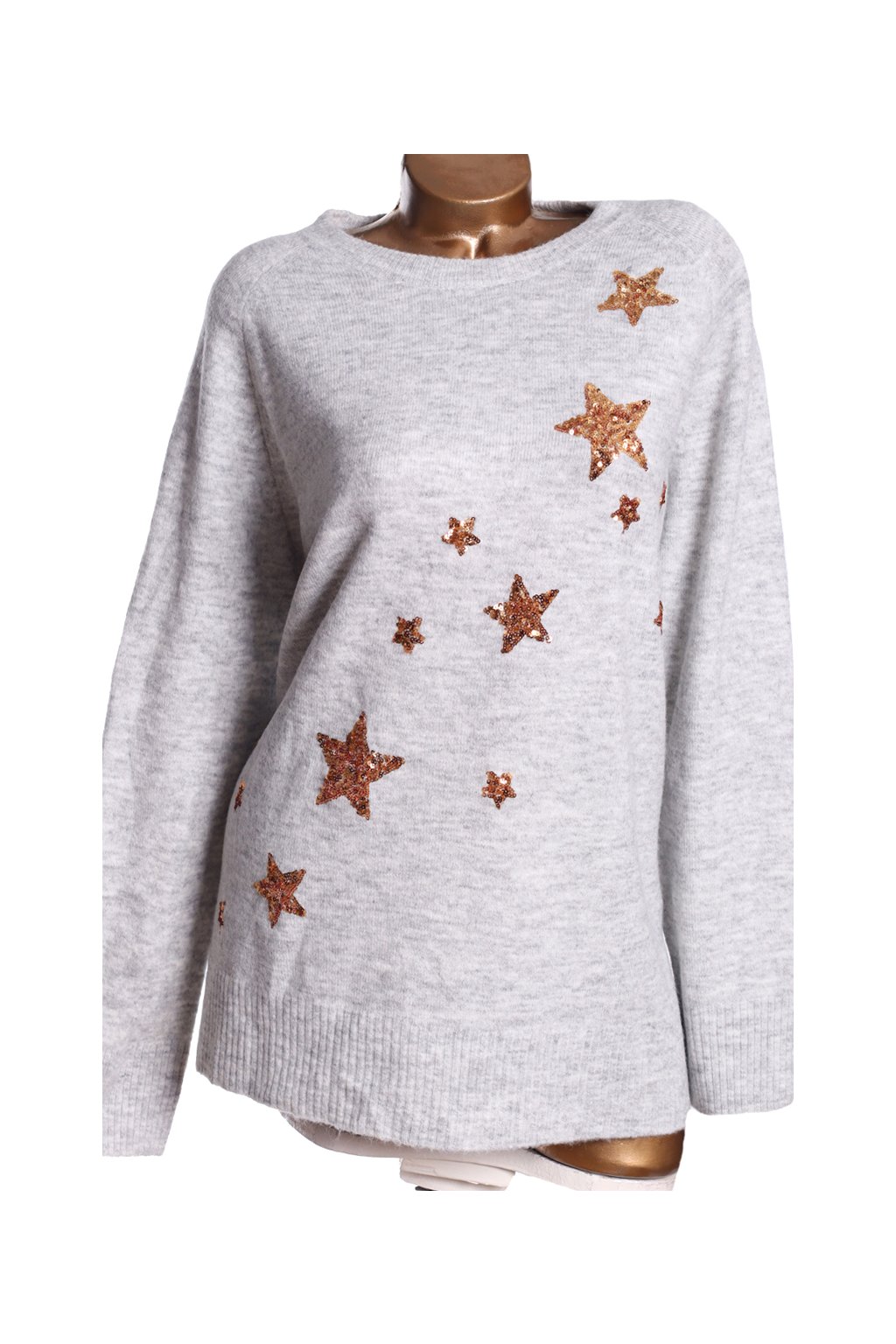 Dámský šedý svetr s flitrovými hvězdami / BONMARCHÉ / XXXXL (52) / UK 24 / ANGLIE