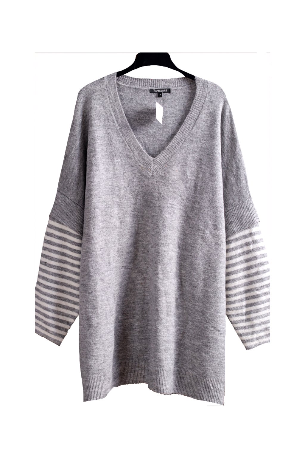 Dámský šedý svetr s pruhovanými rukávy / BONMARCHÉ / XXXXL+ (56) / UK 28 / ANGLIE