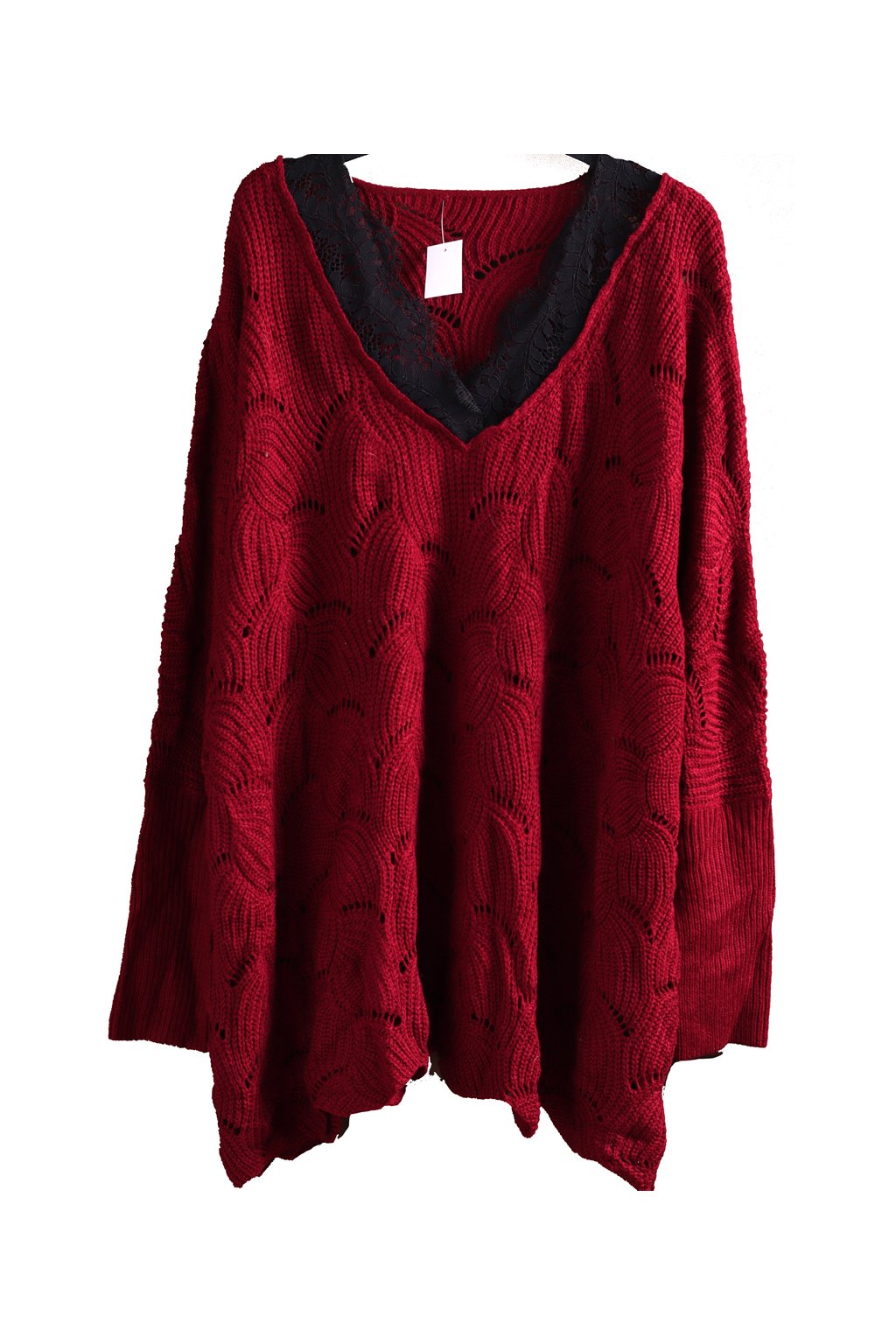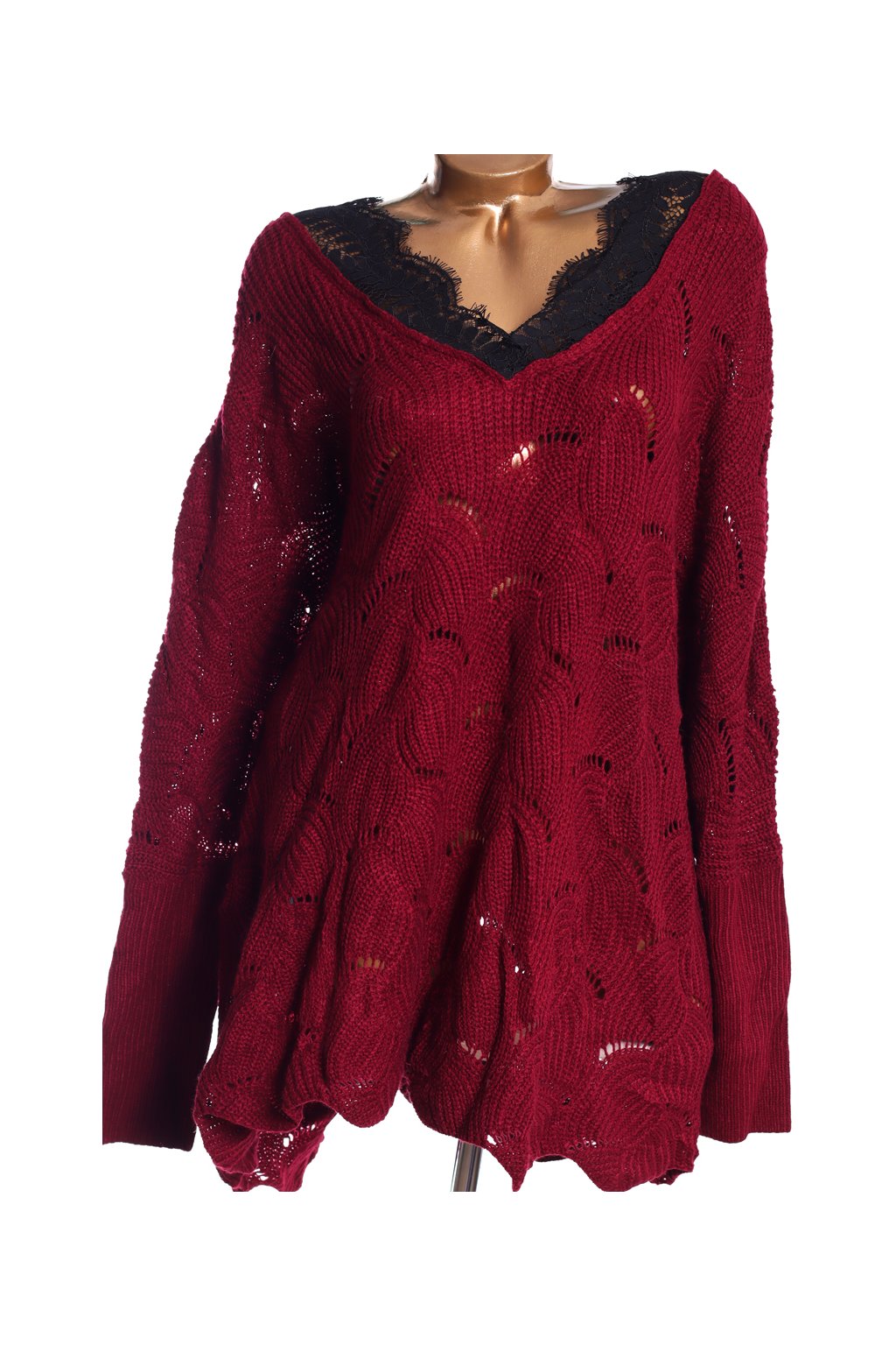 Dámský vínový svetřík s černou krajkou s výstřihem do V / (58/60) / UK 30/32 / ANGLIE